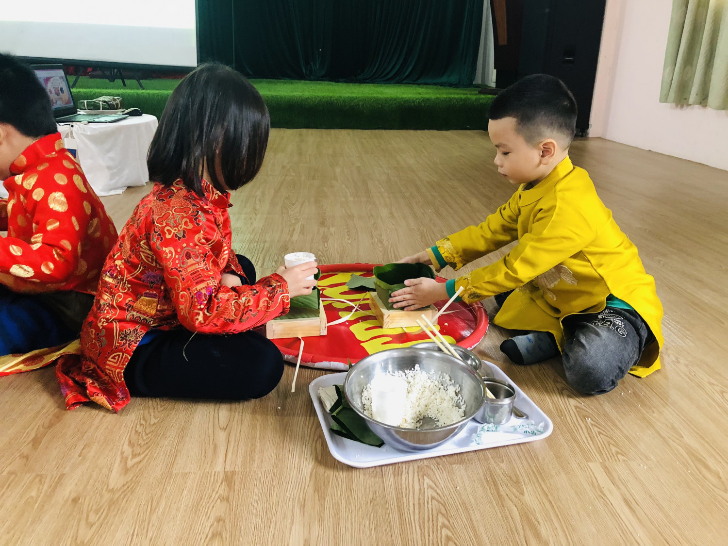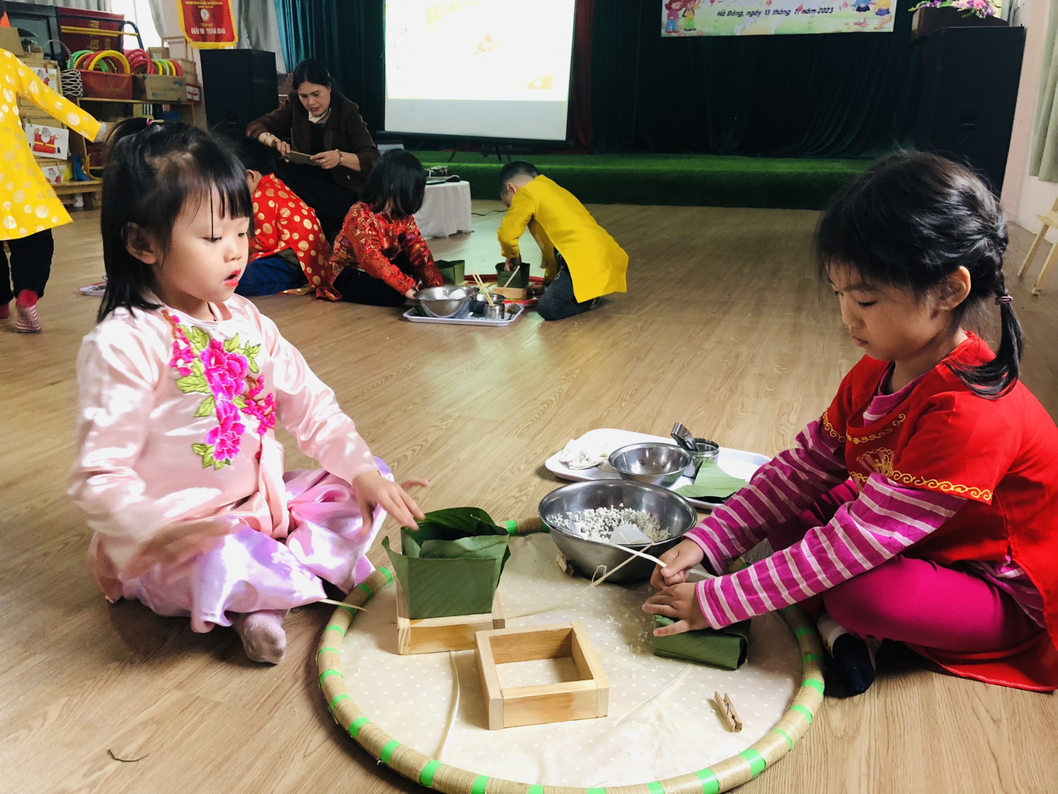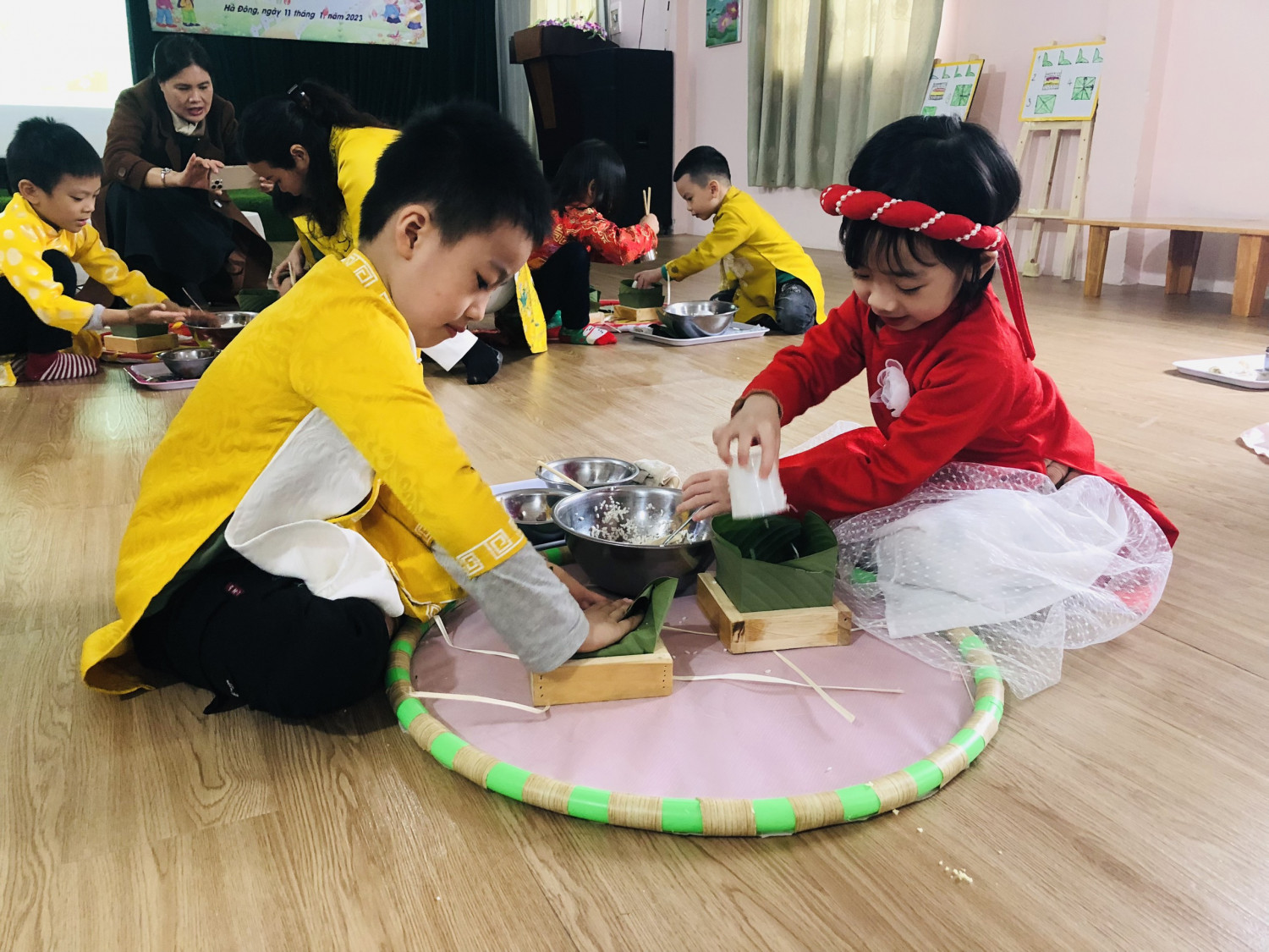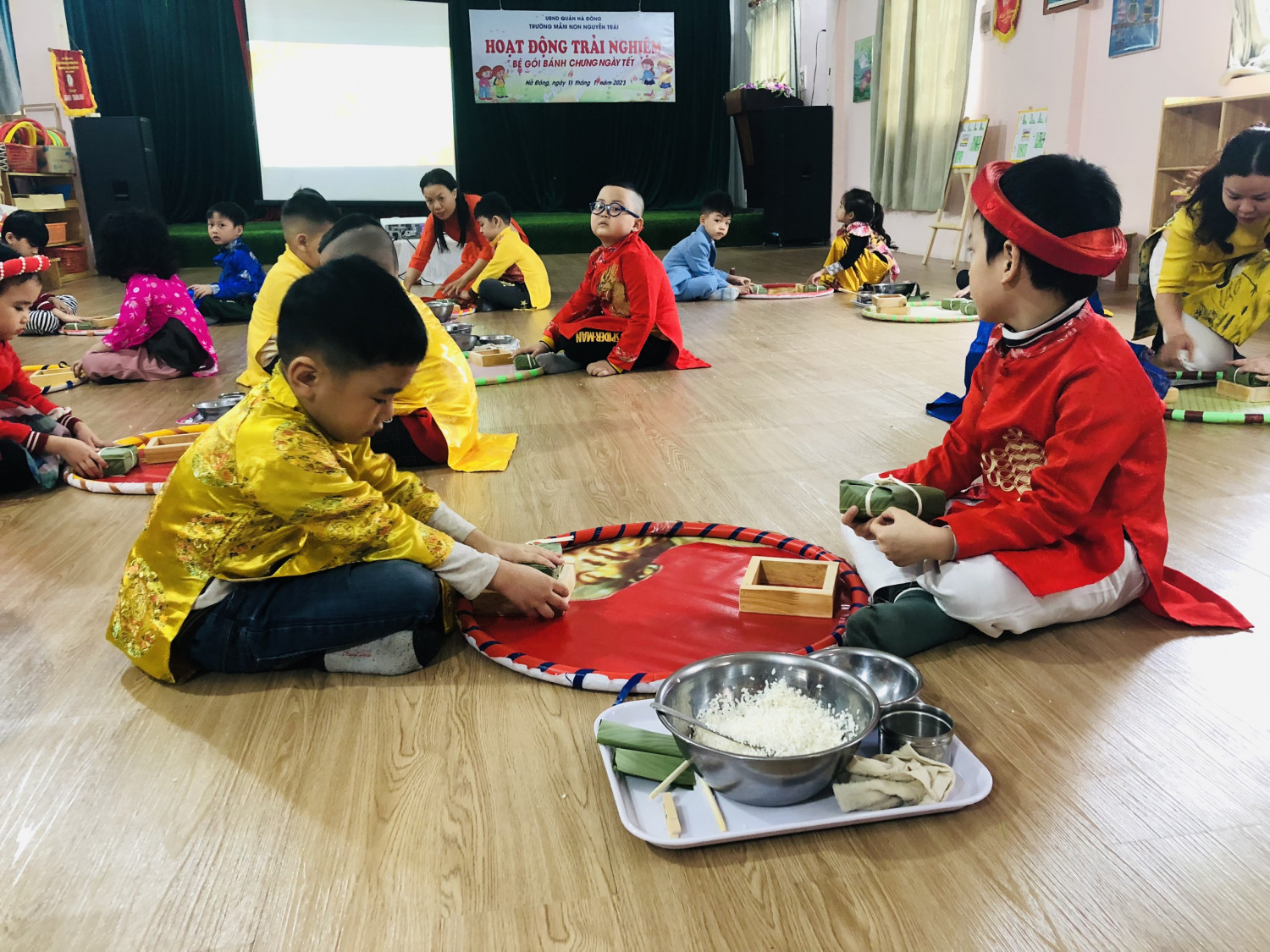 Dưới đâ là các hình ảnh của hoạt động chuyên đề: Trải nghiệm gói bánh trưng của trẻ 5-6 tuổi