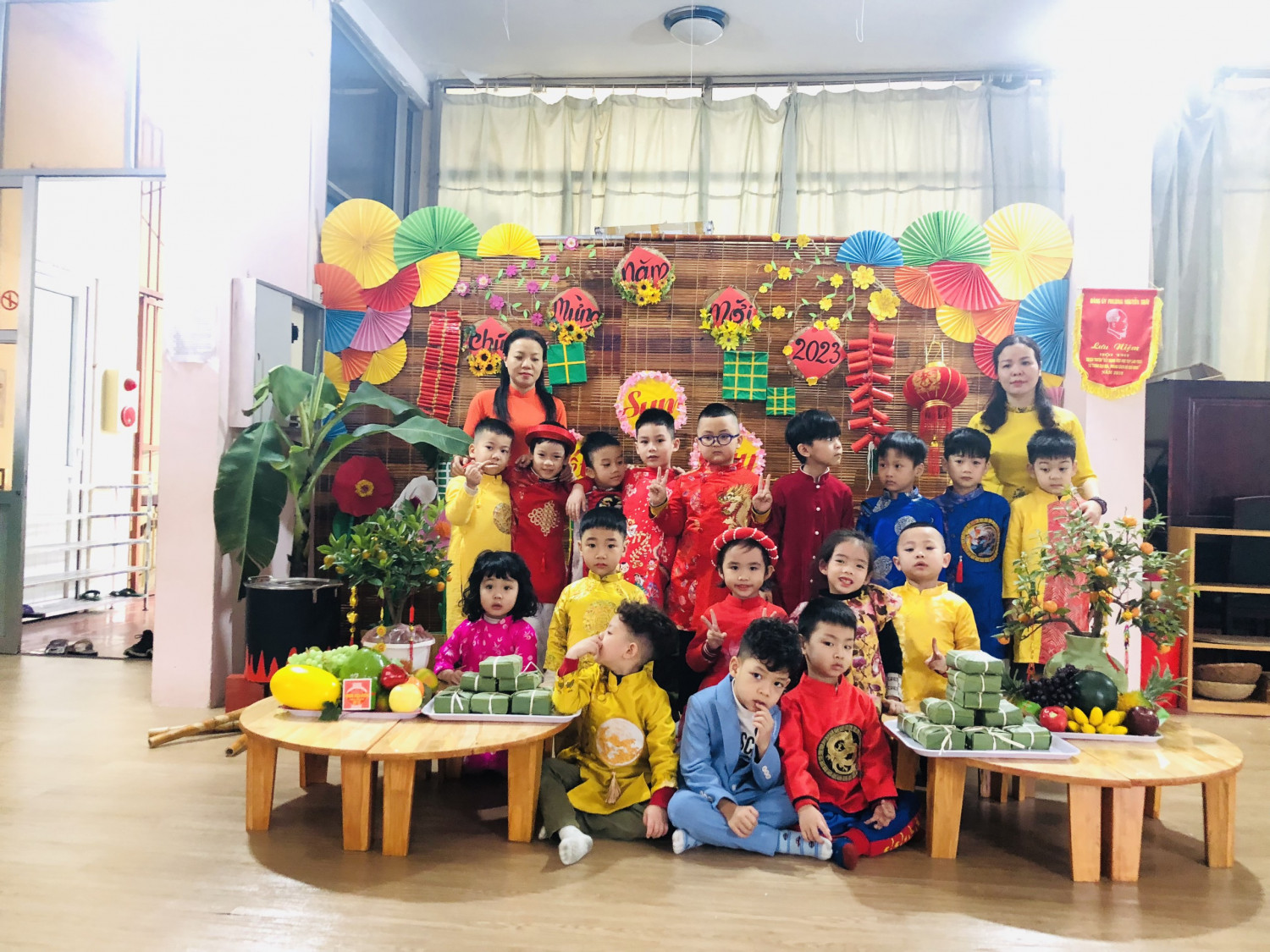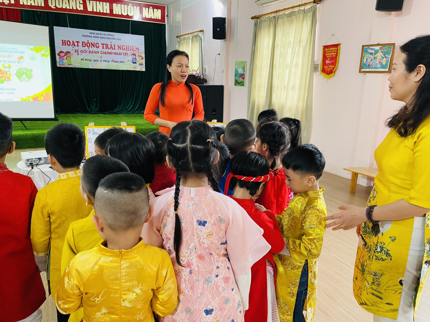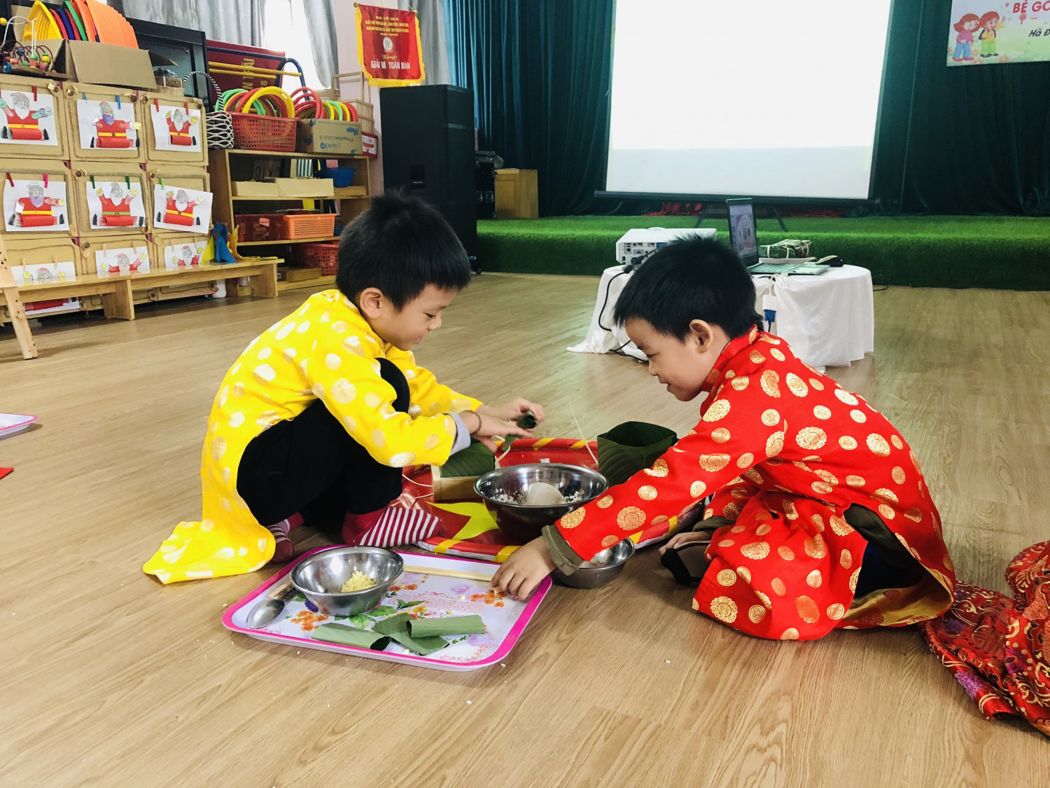 Với những nguyên liệu truyền thống như: Gạo nếp, đậu xanh, thịt lợn, lá dong và lạt buộc, trẻ rất hào hứng khi được trải nghiệm gói bánh trưng. Được các cô hướng dẫn tỉ mỉ từng bước nên trẻ rất tự tin khi xếp lá, đổ các nguyên liệu, đóng gói và xoắn lạt( Có sự hỗ trợ của cô). Chiếc bánh trưng vuông vắn đã được trẻ gói- những ánh mắt thật đáng yêu và vui mừng khi cầm trên tay cái bánh trưng do tự tay mình làm.