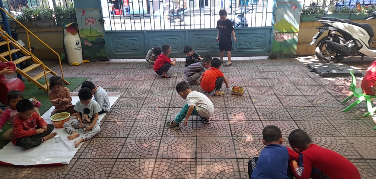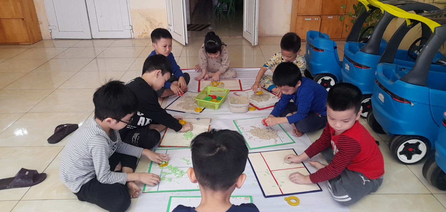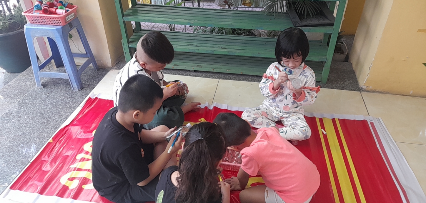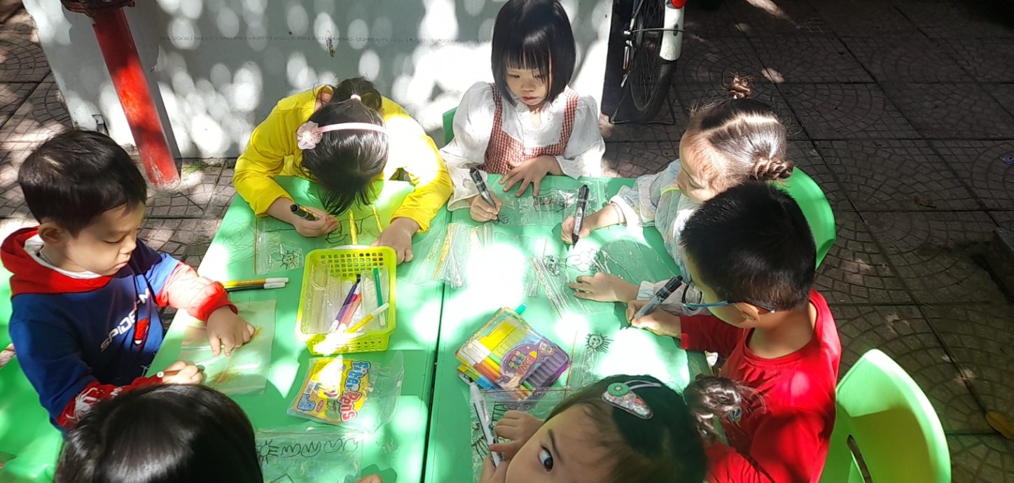 Trẻ được tham gia các hoạt động như: Vẽ lên túi ni nông, vẽ lên chai, hay chơi với cát trọng lực