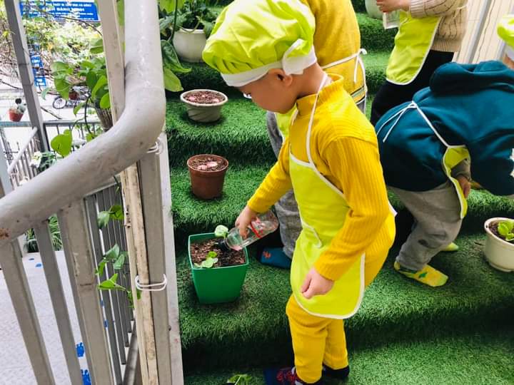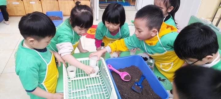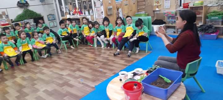 Các bé được cô giáo hướng dẫn cách trồng cây, xem vi deo quá trình phát triển của cây xanh