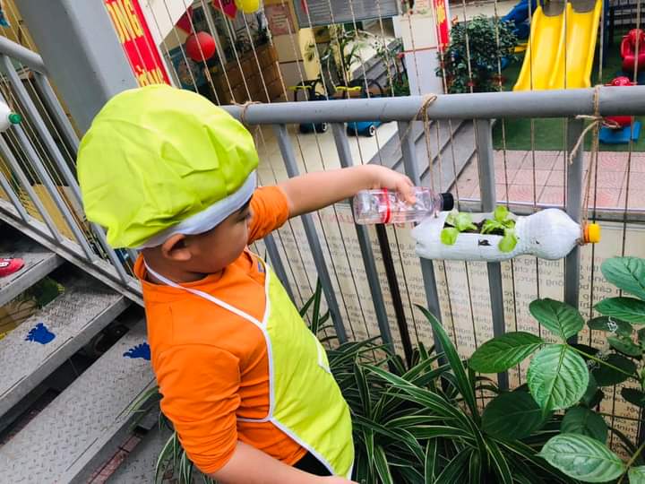 Bé tưới cây sau khi trồng rau vào các chai nhựa tái chế