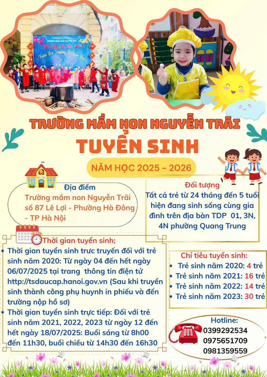 Trường Mầm non Nguyễn Trãi hân hoan chào đón các bậc Phụ huynh cùng các bé đến với mùa Tuyển sinh năm học 2025-2026, đến với ngôi trường ngập tràn ánh nắng và niềm vui hạnh phúc.